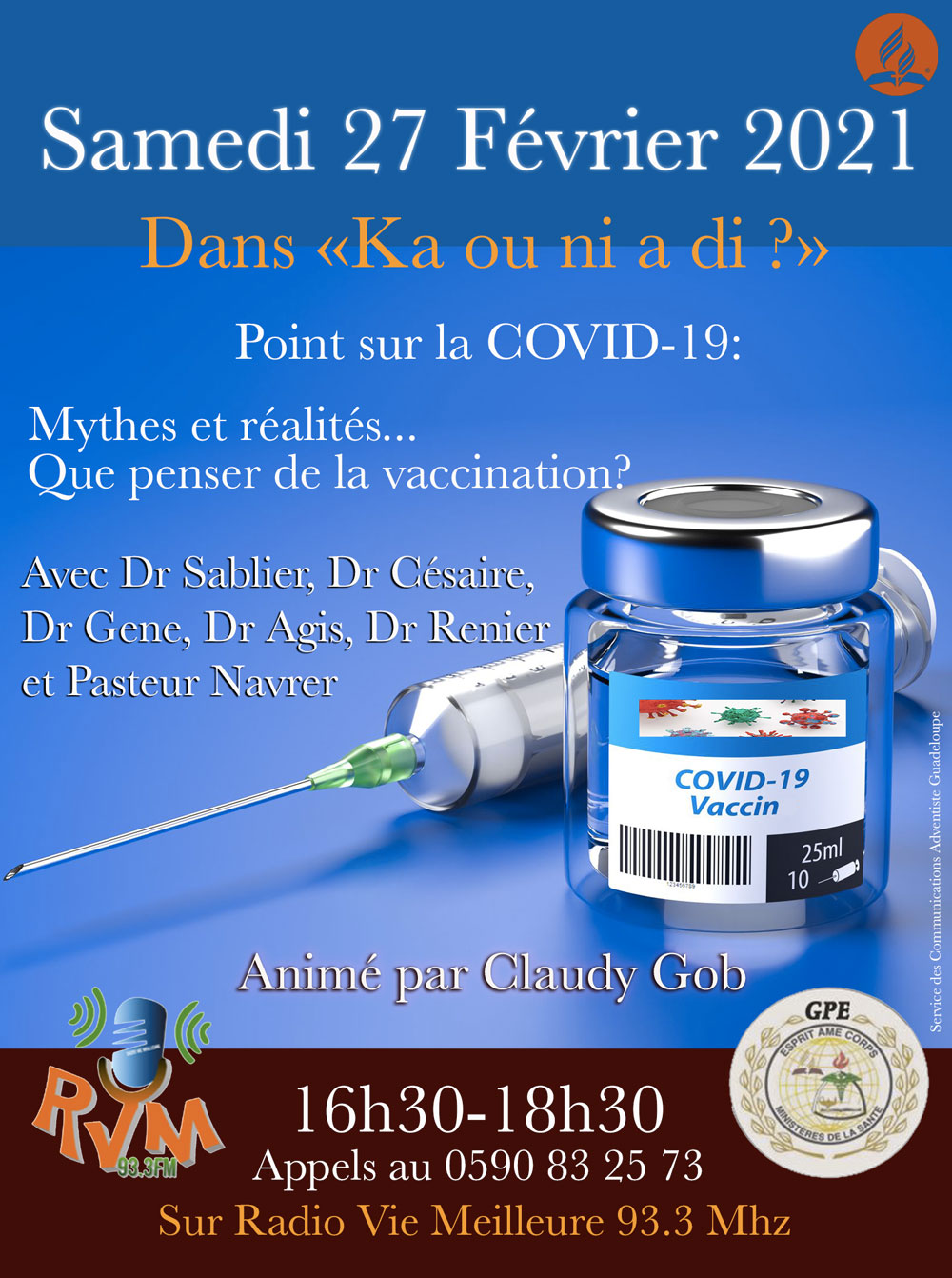 Samedi 27 Février 2021, dans le cadre de l’émission « Ka ou ni a di ? » animé Claudy GOB sur La Radio Vie Meilleure de 16h30-18h30, des spécialistes feront un point sur la COVID-19 en se posant entre autres ces questions: