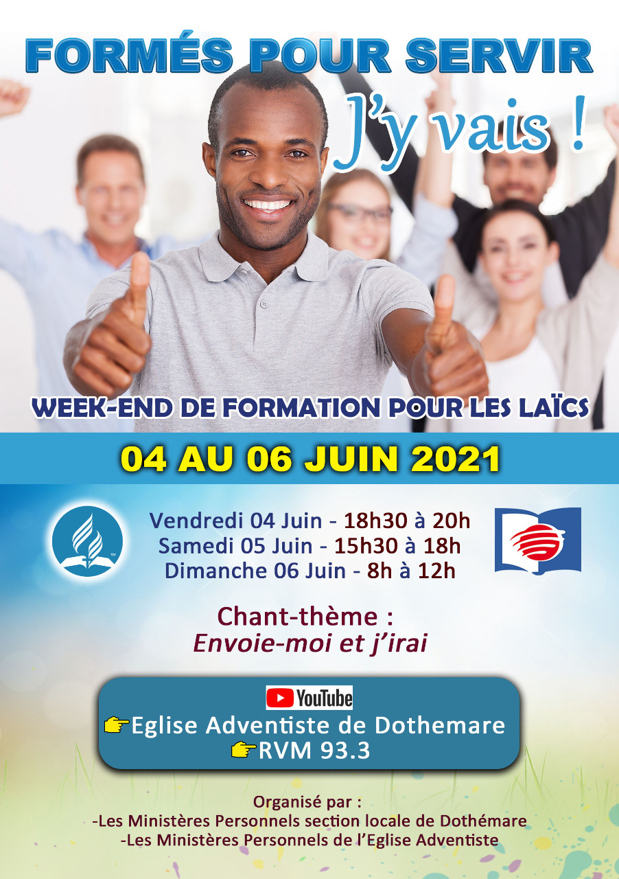 Le département des Ministères Personnels de la Section locale adventiste de Dothémare en partenariat avec celui de l’Eglise adventiste du 7ème Jour de la Guadeloupe, organise un week-end de formation pour les Laïcs du vendredi 4 au dimanche 6 juin 2021 sous le thème : « Formé pour servir, j’y vais ! »